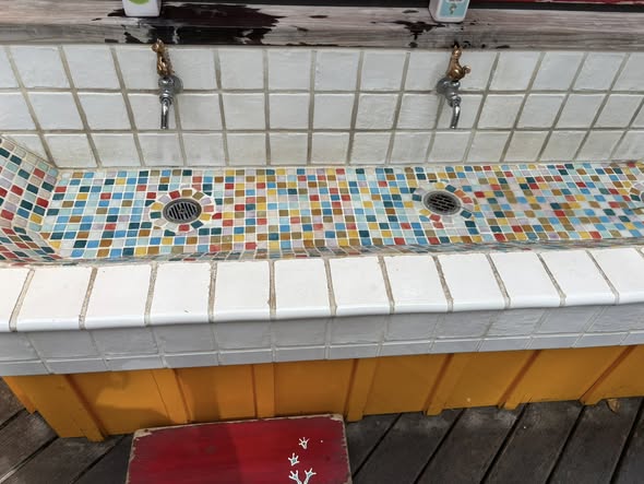 カフェの外の手洗い場の蛇口にはネコ がいて、幼児のための真っ赤な踏み台にはカワイイ足跡があり、ジブリ美術館ならではのデザインのきめ細かさを痛感します。