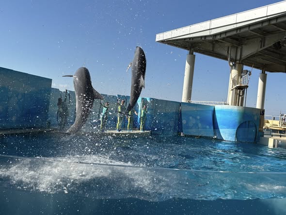 イルカたちは、確かに、それぞれのトリーターと見つめたり、手の合図を見つめながら、声を出したり、泳いだり、ジャンプをしてくれました。