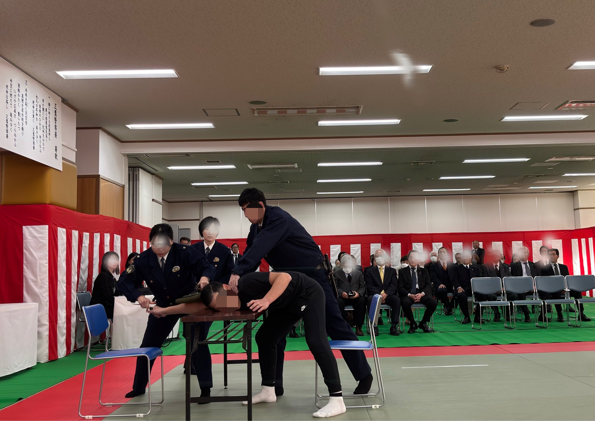犯人役の警察官の演技がまさに迫真そのもので、逮捕術を含む適切な対応の数々に、会場中が息を呑んで見守りました。