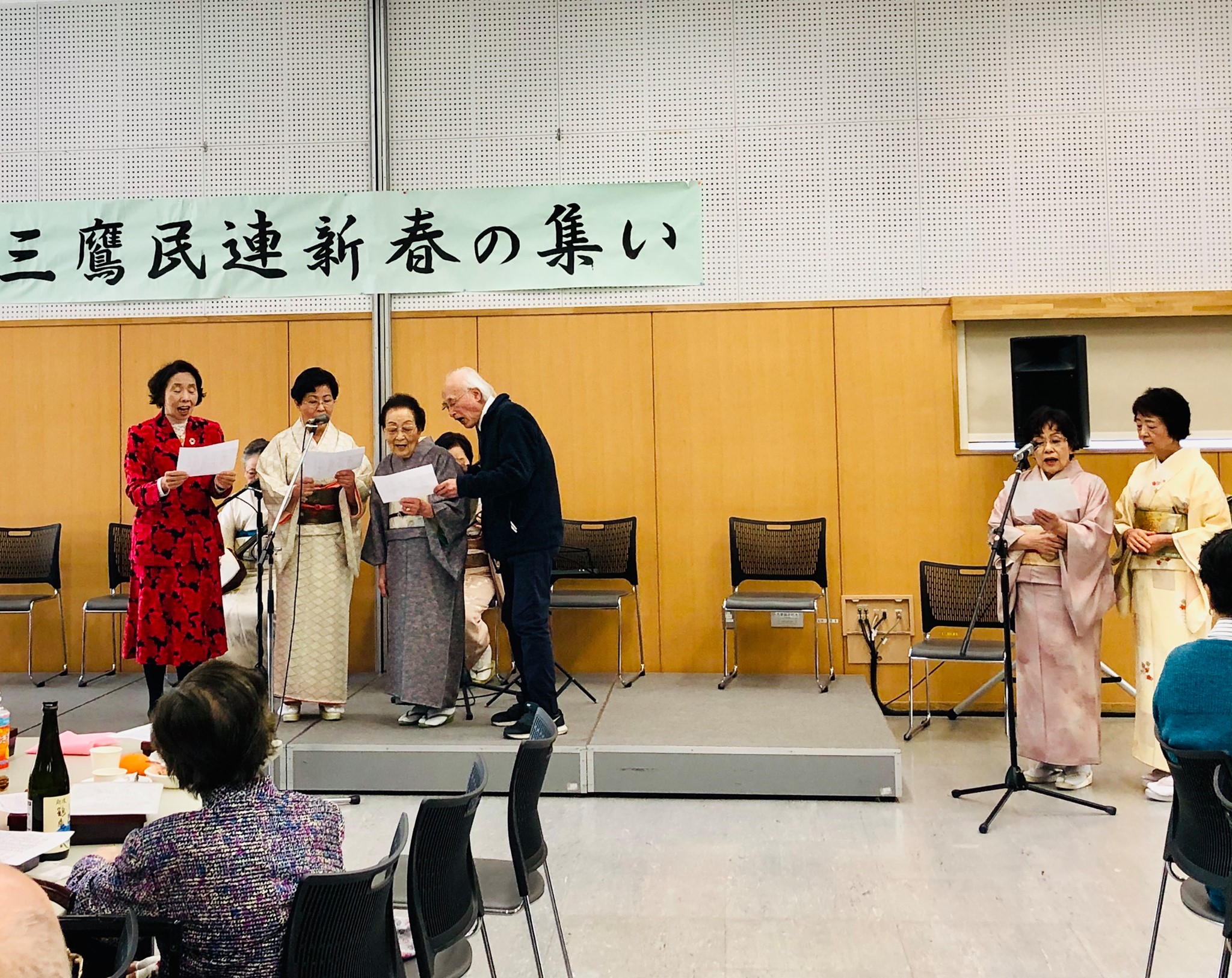 三鷹市公会堂さんさん館で三鷹民謡連合会 新春の集いに60名程の会員と共に、昨年お引き受けした相談役として参加しました。