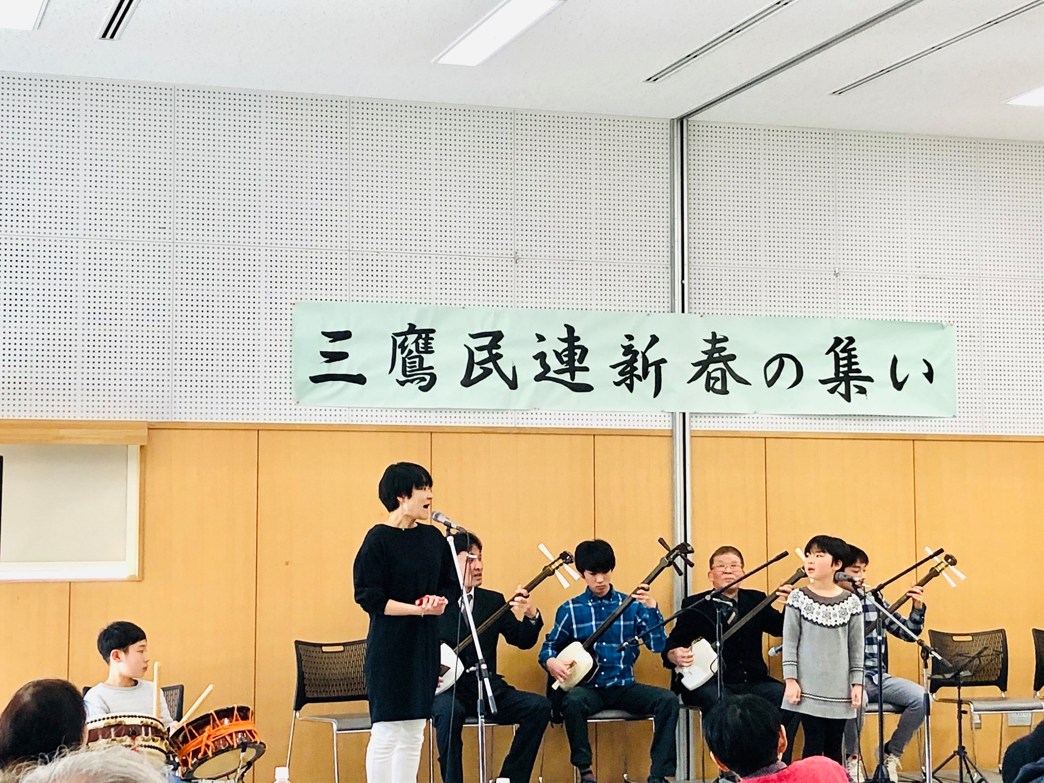 民謡連合会の新春の集いは、「松に鷹」「寿音頭」などお祝いの民謡で始まり、民謡で結ばれる、唄、三味線、尺八、太鼓の息の合った新年を寿ぐ慶びのひと時でした。